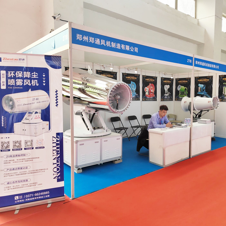 本地展會鄭通出展了霧炮機系列:移動式30米霧炮機和錐體式60米霧炮機。
