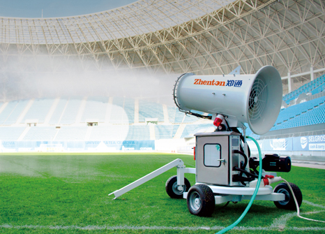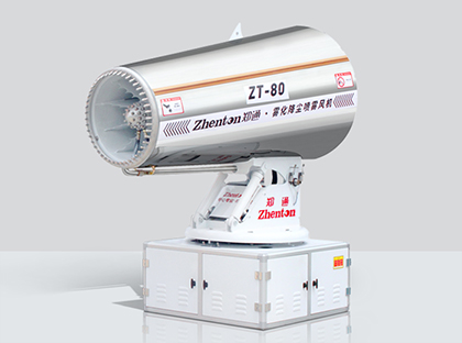 霧炮機(jī)是根據(jù)風(fēng)送原理,先使用進(jìn)口高壓泵、微細(xì)霧化噴頭將水霧化,再利用風(fēng)機(jī)將霧化后的水霧輸送到較遠(yuǎn)距離,使水霧到達(dá)較遠(yuǎn)距離同時(shí)能夠覆蓋更大面積,水霧與粉塵凝結(jié)后降落,從而達(dá)到降塵目的。