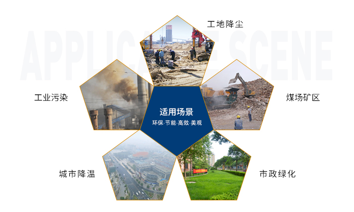 揚塵污染治理:適用于對煤礦行業、化工行業、發電行業、建筑拆遷、工地施工等容易產生揚塵污染的場所進行抑塵、降塵治理;