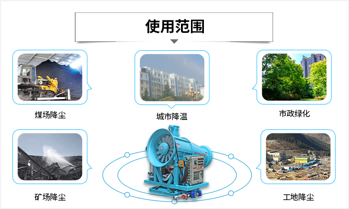 除塵范圍:粉塵治理、露天物料堆場、煤炭物流園區、露天礦山開采、露天爆破粉塵、封閉卸料區、卡車卸料口、自卸車卸料粉塵、大型裝載車工作粉塵、沿海港口裝運、轉運煤炭、礦石、散裝粉料搬運等粉塵污染治理;保濕降溫:飛機場、高速公路、車站、碼頭、公共場所、運動場地、炎熱場地等大范圍降塵保濕降溫消毒;噴藥病害防治:垃圾填埋場、衛生防疫、城市園林綠化以及自然災害過后大面積的殺菌、消毒、除臭、防疫防治病蟲害等。